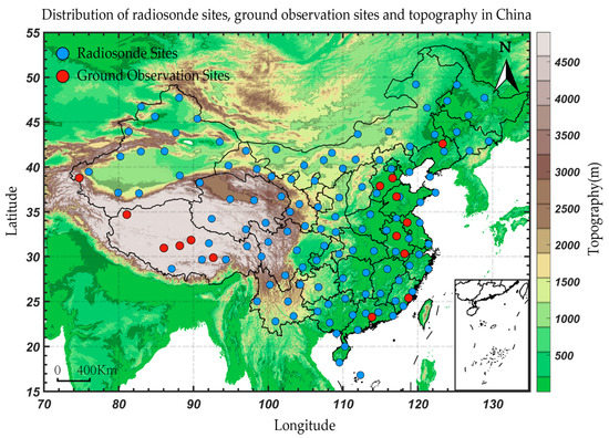 Distribution of radiosonde sites (blue dots), ground observation sites (red dots), and topography (shading) in China.