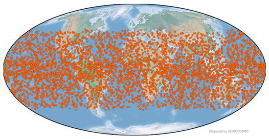 We used GPS occultation data from the COSMIC 2 [31], Metop A [32], Metop B, and Metop C satellites [33]. The GPS signal is in the microwave range and is therefore unaffected by clouds and precipitation [15]. Open-loop tracking technology and an advanced positioning system using the GPS, the Global Navigation Satellite System (GNSS), and a receiver system are used to improve the gain and signal quality for the detection of space weather [34]. GPS occultation data have a wider coverage and are more frequent in time than other satellite data. More than 90% of microwaves can penetrate 1 km above the ground, which is advantageous in research on the PBL. The four stars used in this study provide high-quality observations 7000 times/day.