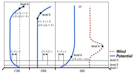 The PBLH of a CBL and a NBL are both set as at the height at which the difference in the potential temperature between that height and the surface reaches a critical threshold δ, and the potential temperature gradient at that height meets the corresponding threshold θr: