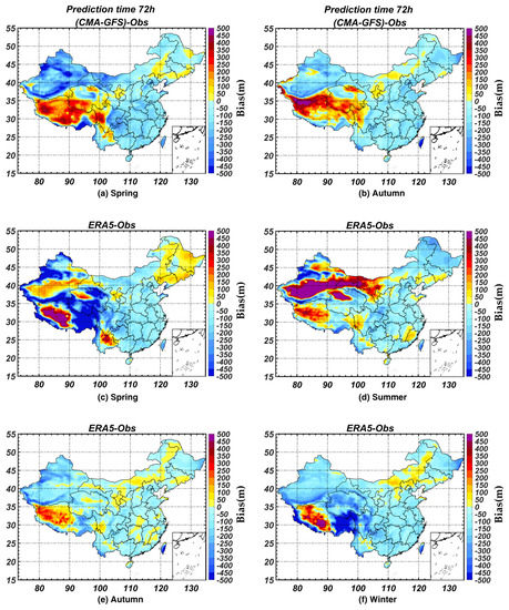 (a,b) The 72 h bias in the forecasts of the CMA-GFS model compared with the observations in (a) spring and (b) autumn, and the bias of the ERA5 reanalysis dataset compared with the observations in (c) spring, (d) summer, (e) autumn, and (f) winter.