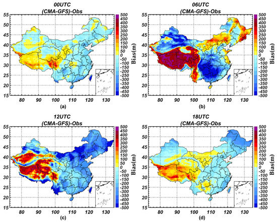 Figure 4 shows the daily average 24, 72 h bias of the PBLH in the CMA-GFS for winter and summer. The bias was almost uniformly negative in most of China in both winter and summer, except for the Qinghai–Tibetan Plateau. The maximum positive bias on the Qinghai–Tibetan Plateau occurred over the northern plateau in summer but over the southern plateau in winter. When the integration moved forward from 24 to 72 h, the positive bias in the eastern Qinghai–Tibetan Plateau extended slightly to the south in summer, because this area is a heat source with a large sensible heat flux throughout the year, which contributes to the large bias of the model and gradually accumulates with the integration time. However, the main pattern of the model bias did not change from the 24 to 72 h forecasts at any time of year (Figure 4a and Figure 5b). We therefore focused on the 72 h model forecast.