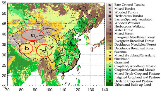 Different underlying surfaces have a significant influence on the development of the boundary layer [17]. We selected four surface types representative of the underlying surfaces in China as prescribed in the CMA-GFS model: barren and sparse vegetation; mixed shrubland and grassland; highland grasslands; and irrigated cropland and pasture (Figure 7).