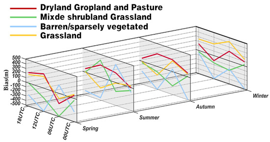 Figure 8 shows that the biases of the model were more prominent in mixed shrubland and grassland, with positive bias throughout the year ranging from 0 to 200 m. In the barren and sparse vegetation area, there was an overestimation at 1200 UTC in summer and an underestimation at all other times and seasons by a maximum of −500 m at 0600 UTC in spring, when the development of turbulence was at its peak. In addition, the bias of up to 200 m tended to be more evident in the highland grassland areas in winter. The model underestimated the PBLH in irrigated cropland and pasture areas, with a maximum of more than −500 m in winter but overestimated the PBLH at 0600 UTC in spring and summer.