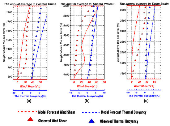 Observed (triangle) and CMA-GFS model (dotted line) annual average wind shear (red) and thermal buoyancy (blue) in (a) East China, (b) the Qinghai–Tibetan Plateau, and (c) the Tarim Basin.