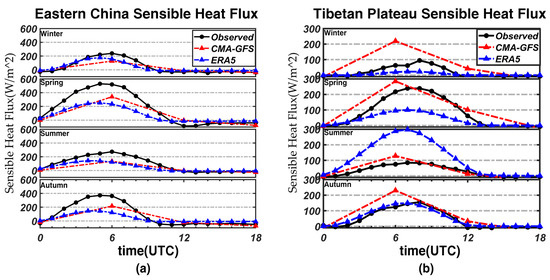 Station observations (black), CMA-GFS forecasts (red), and ERA5 dataset (blue) of the sensible heat flux in different seasons for (a) Eastern China and the (b) Qinghai–Tibetan Plateau.