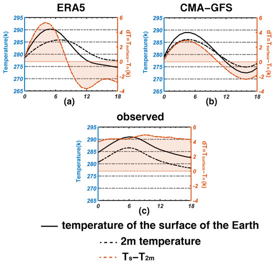 where Ts is the surface temperature, T2m is the temperature 2 m above the surface, dT is the difference in temperature between them, and subscript s represents the surface. The larger the value of dT, the stronger the upward transfer of heat from the surface, which has a positive effect on the sensible heat flux. Figure 11 shows that both the CMA-GFS model and ERA5 are in good agreement with the observation for T2m but significantly underestimated Ts and, thus, dT, which is why the both CMA-GFS and ERA5 underestimated the sensible heat flux. CMA-GFS and ERA5 showed a similar bias producing mechanism, i.e., underestimation of Ts leads to underestimation of sensible heat flux and, then, PBLH. This means that the mechanism explaining the biases in PBLH in East China is reliable. Ts is calculated through surface energy balance equation, which is decided by net shortwave and longwave radiation fluxes and turbulent sensible and latent heat fluxes at the surface. From Figure 11, underestimation of Ts was uniform during the day and at night; so, shortwave radiation fluxes may be not the reason, since there are no shortwave radiation fluxes at night. Therefore, the underestimation of Ts and sensible heat flux might be related to biases in longwave radiation fluxes and latent heat fluxes, which means that the surface layer scheme and longwave radiation parameterization in the model should be improved in the future.