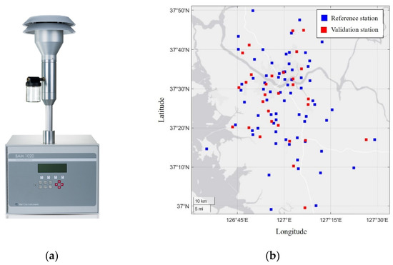 In this study, the hourly PM2.5 and PM10 concentration data measured at a total of 100 national monitoring stations for 1 year and 6 months (1 January 2020 to 31 May 2021) were used. The PM concentration data were acquired through sensors that employ a β-ray absorption method installed in each monitoring station (Figure 1b). In the subject area of the study, a PM monitoring network, which consisted of a total of 130 national monitoring stations, was operated. While monitoring station data with measurements omitted for more than 100 days during the target period of 1 year and 6 months were excluded from the experiment, PM observation data measured at a total of 100 monitoring stations were used. Figure 1b shows the monitoring stations (locations of PM concentration measurement) used in this study. Among all monitoring stations, observations at 70 monitoring stations (blue dots in Figure 1) were used as reference data, whereas observations at the remaining 30 monitoring stations (red dots in Figure 1) were used for accuracy validation. The average distance from one reference station to the nearest four reference stations is 7.75 km, and the average distance from one validation station to the nearest four reference stations is 5.45 km (Table 1).