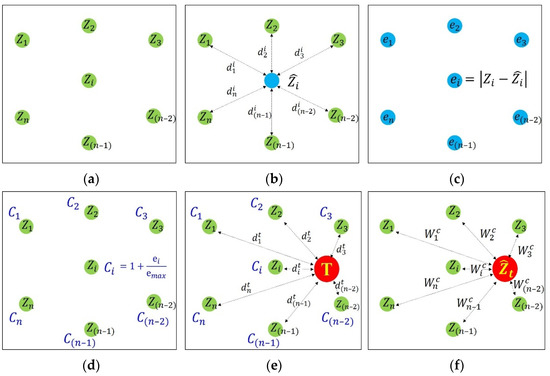 In the first step, the interpolation accuracy for each known point is calculated based on the Leave-One-Out Cross Validation (LOOCV). Given n measurements (Z1, Z2, …, Zn−1, Zn) for n points (green circles in Figure 3a), an estimate ( for the ith point (blue circle in Figure 3b) is calculated based on IDW interpolation using the neighboring observations (Figure 3b). That is, the estimated value for each known point is derived by performing Leave-One-Out interpolation. Subsequently, the absolute error, ei, of LOOCV is calculated using the observed value, Zi, at the ith point. This first step is repeatedly performed until the absolute error of LOOCV is calculated at all known points (Figure 3c).