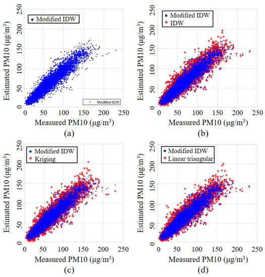 Comparison between estimated and observed PM10 values: (a) modified IDW, (b) IDW and modified IDW, (c) kriging and modified IDW, and (d) linear triangular and modified IDW.