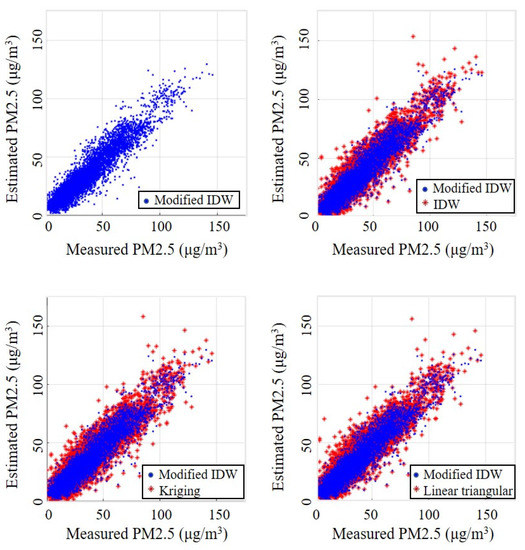The modified IDW showed better performance than conventional methods for both the PM10 and PM2.5 interpolation. Table 2 shows RMSE and MAPE of interpolations for PM10 and PM2.5. The results of modified IDW achieve the lowest RMSE and MAPE. The accuracy of the interpolation methods in terms of RMSE and MAPE decreased in the order of the modified IDW, IDW, linear triangular, and kriging. Figure 4 and Figure 5 show the comparisons of the PM10 and PM2.5 concentrations estimated with each interpolation method and the observed values. The blue dots in the figures indicate the results of the proposed modified IDW, and the red asterisks indicate the results obtained from the conventional methods. Figure 4 and Figure 5 show that the proposed interpolation method estimates PM10 and PM2.5 more accurately compared with the other methods