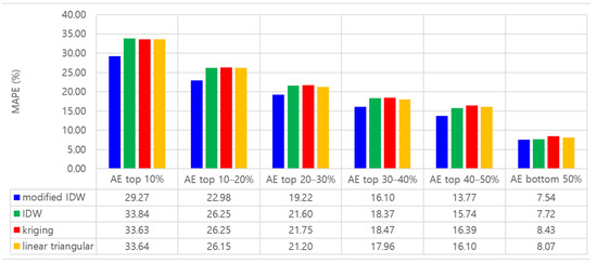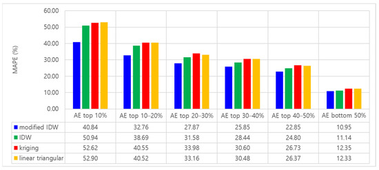 In this study, in order to more clearly confirm the performance improvement of the proposed method that came from the reflection of the local specificity that cannot be explained by the relative positional relationship, the results of interpolations were compared according to the AE (absolute error) level of the PM estimation. To this end, PM estimations were classified into six groups according to AE levels: AE top 10%, 10–20%, 20–30%, 30–40%, 40–50%, and bottom 50%.