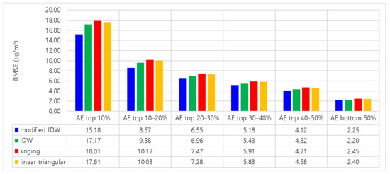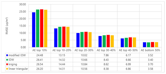 The performance of modified IDW was generally better than the conventional methods for all AE groups. In particular, for groups of higher AE, the accuracy differences between the proposed and the conventional methods were increased. Figure 6 and Figure 7 show the MAPE and RMSE of the PM10 interpolation for each AE group. These figures confirm the MAPE and RMSE of PM10 estimations using the proposed method were generally lower than the conventional methods regardless of the AE groups. Additionally, the larger the value of AE, the relatively higher the accuracy is in the case of the modified IDW compared with those of the other algorithms. That is, for the AE top 10% group, the MAPE and RMSE values of the proposed method were 4.36–4.57% and 1.72–1.93 μg/m3 lower than the other methods. Figure 8 and Figure 9 show the MAPE and RMSE of the PM2.5 interpolation for each AE group. The accuracy of the PM2.5 estimation for the AE groups exhibited a similar tendency to that of PM10. That is, the proposed method achieved the lowest MAPE and RMSE values. Furthermore, as the AE increased, the differences between the error of the proposed and other methods increased. In the case of PM2.5, the MAPE and RMSE values of the modified IDW in the AE top 10% group were 10.10–12.06% and 1.99–2.83 μg/m3 lower, respectively, than those of the other methods.