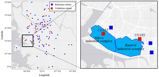 In this study, the error is confirmed for each validation station to evaluate the proposed method precisely (Table 3). Among all the validation stations, those that exhibited the highest error based on RMSE were the stations 131192 (20.98 μg/m3) and 131232 (15.10 μg/m3). The reason that estimations of stations 131192 and 131232 show relatively lower accuracy is as follows. Most spatial interpolation methods, including the proposed method, determine the estimate within the maximum and minimum range of observations. Therefore, without observations for a point showing a significantly different PM concentration, the accuracy of PM estimations can be decreased, where stations 131192 and 131232 are located near the industrial areas (Sihwa and Banwol industrial complex), and the reference stations around them are located in residential areas (Figure 10), and they show consistently higher concentrations of PM10 and PM2.5, respectively. At the time of observation (the year 2020), monthly mean PM10 concentrations of station 131192 were 19–25 μg/m3 higher, and monthly mean PM2.5 concentrations of station 131232 were up to 12 μg/m3 higher than the surrounding reference stations. On the other hand, the PM2.5 concentration of station 131192 and the PM10 concentration of station 131232 did not show a significant difference from those of neighboring reference stations. This tendency of PM distribution explains the reason for the highest errors in the two stations.