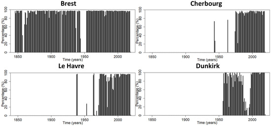 Year-by-year availability of sea-level data from Brest, Le Havre, Cherbourg, and Dunkirk.