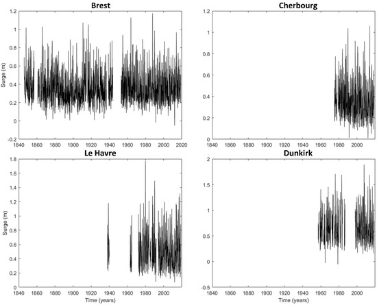 To maximize the temporal lengths of these time series and to prevent the loss of information, the start years used to analyze these datasets were not equal in this study. Dunkirk station was analyzed between 1957 and 2018, Le Havre station between 1972 and 2018, Cherbourg station between 1975 and 2018, and Brest station between 1846 and 2018.