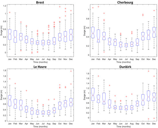 Boxplots of monthly maxima surges at Brest, Cherbourg, Le Havre, and Dunkirk. The lower parts of the boxes represent the 1st quartiles, the red lines represent the medians, and the upper parts represent the 3rd quartiles. The upper part and lower part of the dashed lines are, respectively, the maximum and minimum values for each month considered. The red marks are the outliers, i.e., values that are more than 1.5 times the interquartile range. Please note that the analysis using boxplots started in different years for the different stations (1846 for Brest, 1975 for Cherbourg, 1972 for Le Havre, 1957 for Dunkirk) but ended in 2018 for all stations. Note also that outliers were not omitted from the time series and computations in this article, since these values are not measurement errors but real extreme levels.