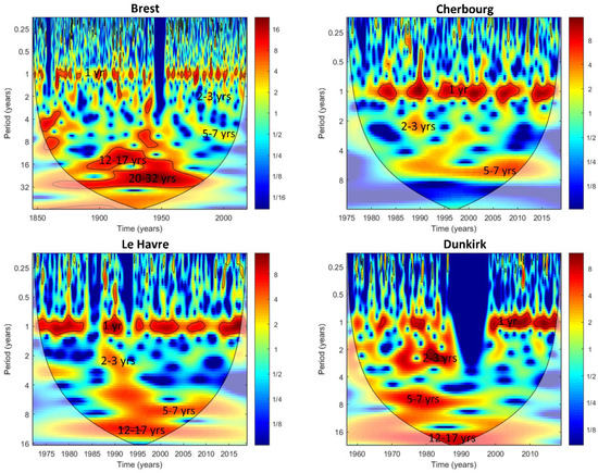 Continuing at lower frequencies, all stations situated in the English Channel and Brest showed an increase in the ~5–7-year variability from around 1980 to the present day, whereas this increase appeared approximatively between 1965 and 1990 at Dunkirk. Dunkirk and Le Havre also displayed a ~12–17-year variability over the entire time series, while in Brest, this variability was statistically significant between 1890 and 1960 (Figure 5).