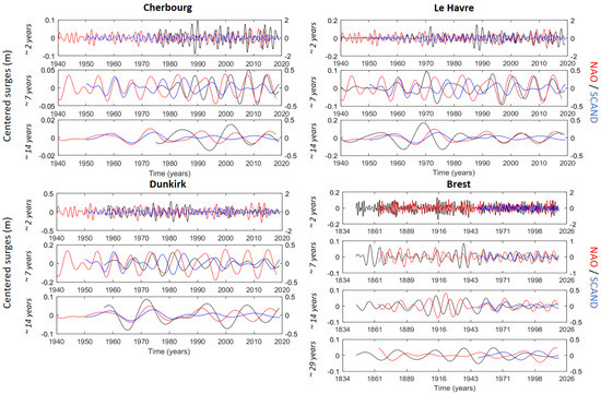 Reconstruction of multi-year modes of variability of monthly maxima surges (black) at Cherbourg, Le Havre, Dunkirk, and Brest, and of SCAND (blue) and NAO (red) using MODWT.