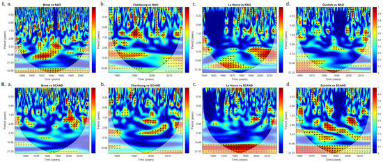 Wavelet coherence between (I) NAO and the monthly maxima at (a) Brest, (b) Cherbourg, (c) Le Havre, and (d) Dunkirk and (II) SCAND and the monthly maxima at (a) Brest, (b) Cherbourg, (c) Le Havre, and (d) Dunkirk. The arrows represent the phase between two signals: if the arrow points to the left, the signals are in antiphase; if the arrow points to the right, the signals are in phase; and if the arrow points at 90°, the signals are in quadrature. Surrounding spots are statistically significant (Monte–Carlo test).