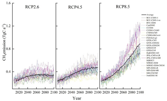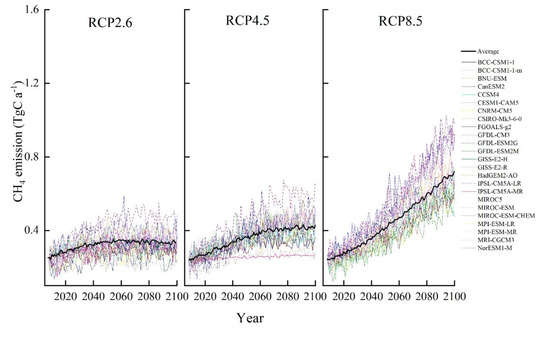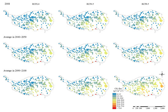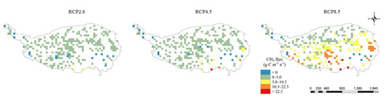 Several studies have estimated CH4 emissions from wetlands on the Qinghai–Tibet Plateau for periods from 1995 to 2005 (2.47 TgC·a−1) [27], 1949–2008 (0.06 TgC·a−1) [16], 1979 to 2012 (0.96 TgC·a−1) [28], and 2000 to 2010 (0.22 TgC·a−1) [29]. However, CH4 emissions from Plateau wetlands under future climate conditions remain quite uncertain. In this study, based on a processed model of TRIPLEX-GHG [23], we predicted spatial and temporal patterns of CH4 emissions from the Qinghai–Tibet Plateau wetlands from 2008 to 2100 under three concentration pathways (RCPs) of future climate change scenarios.