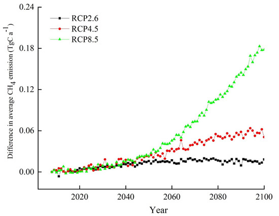 In fact, the difference in average annual CH4 emission between the situations when CO2 concentration was allowed to rise or was held constant increased over time under all three RCPs (Figure 3). Under the scenario of RCP2.6, the emissions difference increased from 2008 to 2100 by 0.02TgC·a−1, showing a slight upward trend. Under the scenario of RCP4.5, the emissions difference is enhanced to 0.06TgC·a−1 by 2100, then slowly rises in the early and middle part of the 21st century and rises rapidly in the later part. Under the scenario of RCP8.5, the CH4 emission difference shows a linear upward trend, and is enhanced to 0.18TgC·a−1 in 2100. The rate of increase per year was the slowest in RCP 2.6 and the fastest in RCP 8.5. Under all three RCPs, elevated CO2 enhanced CH4 emissions more in the second half of the 21st century than in the first half.