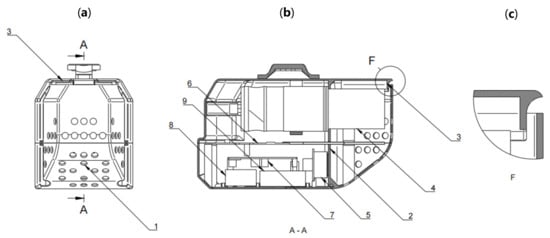 (a) Frontal view of the payload enclosure; (b) sectional view; (c) regional zoomed-in view of air inlet. (1) Ventilation perforations; (2) chamber separator; (3) downwash flow spoiler; (4) CARBON3060S with cap and filter removed; (5) CO-B4 electrochemical sensor; (6) iMet-4 RSB; (7) data collection circuit board; (8) CR123A battery set; (9) 2600 mAh lithium-ion battery set.