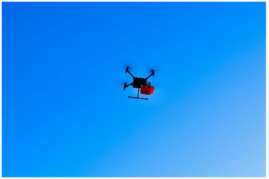 DJI Matrice 200 (https://www.dji.com, last access: 23 January 2022) is the sole model of UAV used for the development and testing of the payload. The Matrice 200 is produced by DJI for industrial applications and was discontinued in 2020. With the large-capacity TB55 batteries equipped, the aircraft weighs 4.53 kg, can carry payloads up to 1.61 kg of mass, and has a maximum flight time of 38 min. Its maximum speed for ascent is 5 m/s and the top ceiling for service is 3000 m from sea level, although DJI ordinarily limits the flight height to 500 m above ground level for safety-related reasons. Although there are other manufacturers and drone models that are potentially more suitable for our use in this case, from the perspectives of payload and flight capacities, the DJI Matrice 200 is a good compromise between performance, reliability, flight difficulties and costs.