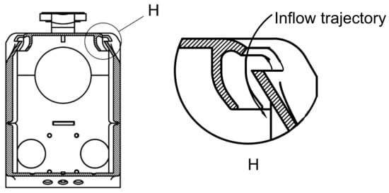 The frontal sectional view of the measurement chamber and zoomed-in view (H) of the downwash flow spoiler responsible for adjustments of flow velocity and direction.