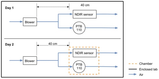 Chambered and chamber-less comparative measurement test setups illustrated with a simplified diagram. The blower is optimally placed and configured to acclerate airflow for producing simulated rotor downwash flow. The indoor environment is relatively enclosed, with no known source or sink of CO2 and no source of extra airflow. We used a CARBON3060 NDIR sensor and a Vaisala PTB-110 barometer for measuring CO2 concentration and air pressure.