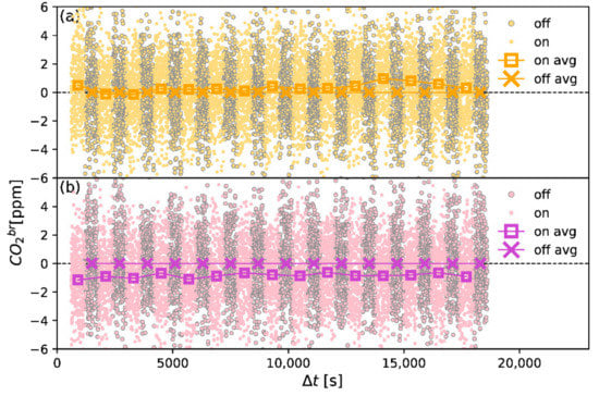 For clarity, we present time series of (background trend removed with moving average window of 1200 s) of 15 test iterations to exemplify CO2 concentration anomalous biases relative to the background. Whereas brighter and darker dots represent soundings recorded when the blower was switched on and off, the square and cross markers are averages of each of the segments. Therefore, the differences between averages represent the outcomes of test airflow blowing at chambered (a) and chamber-less setups (b).