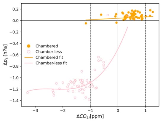 Distribution of mean CO2 concentration anomalous biases () with respect to mean air pressure anomalous biases () of individual test iterations for the chambered and chamber-less setups.