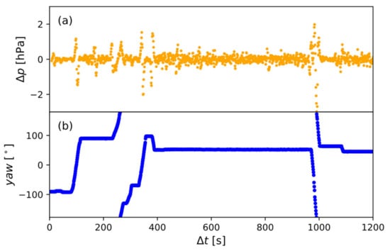 Measurement anomalies of pressure background trend removed with a moving average window size of 16s to capture yaw-related variations during ascent from 0 m to 50 m above ground level of a payload test flight (a). As seen from the UAV yaw values (b), occurrences of measurement anomalies of pressure coincide with yaw value variations at respective time periods.