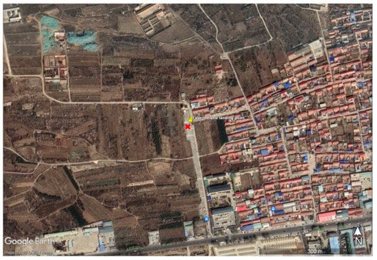 We managed to secure a cylindrical airspace 500 m in diameter and 1 km above ground level height within the Yanqing district of rural Beijing, the mean above-sea-level height of which is approximately 510 m. The ground-level temperature was between 0 to −13 °C because the date of test was the 13 January 2022. As shown in the satellite image of Figure 8, the measurement location is chiefly surrounded by agricultural lands with a mid-sized village on the eastern side. The road seen near the bottom of the image is the main traffic route of the surrounding dwellings and industrial facilities; however, traffic was scarce throughout the test window. The weather of the day was clear with no cloud coverage. There were northwestern winds only during the day time, which was consistent with local prevailing trends. Therefore, we expect a stable near-surface atmospheric condition.