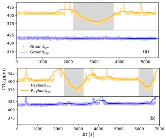Unprocessed CO2 measurements from payload and close-proximity ground measurment (Figure 8) for day time (a) and night time (b). Grey areas separately represent the time intervals of flight 1, 2 and 3. Without any corrections, the difference on average between the measurements of both sensors is approximately 10 ppm throughtout the tests.