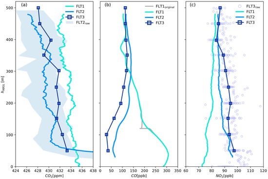 Vertical atmospheric profile of mole fraction density distributions for CO2 (a), CO (b) and NO2 (c) during ascent of all three test flights at Yanqing, Beijing. While the moving averages of measurements of the first two flights are plotted with continuous lines, the third flight is exhibited in connected dots (accepted measurements for each height level) due to its distinctive flight trajectory. The three subplots respectively contain information of different data processing methods including simple moving averages of every 60s (flight 2 CO2), FLT2raw represents area covered by raw measurements, its left and right borders represent maximum deviations from running averages; ascent cessation smoothening (flight 1 CO), FLT1original is the profile without smoothening at the cease flight point; and variance-filtered arithmetic mean for individual height levels (flight 3 NO2), FLT3raw represents vertical distribution of measurements before filtering and averaging.