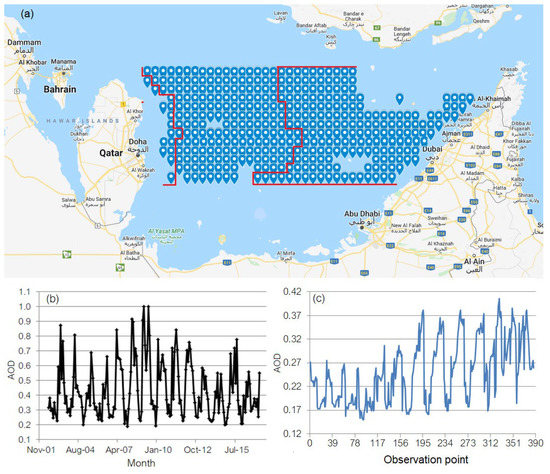 Data used in this study are monthly AOD series retrieved by Terra MODIS (at a wavelength of 412 nm) at 387 points from July 2002 to April 2017 in the Arabian Gulf Region (Figure 1a), between 24.95–26.25 latitudes and 51.55–55.75 longitudes. The series retrieved at the point of coordinates 26.15 latitude and 51.55 longitude is presented in Figure 1b and the series recorded in January 2003 is shown in Figure 1c.