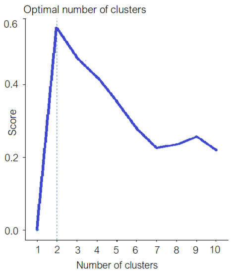 Different scientists introduced various tests for detecting the optimal number of clusters. Although some are more commonly used (because they are well-known or easier to compute), there is no reason to give more credit to one or another, mainly because they rely on different mathematical and computational techniques. Therefore, the strategy for establishing the optimal number of clusters was a multi-criteria decision obeying the majority rule after performing 30 different tests, including silhouette [53], gap, Duda, Dunn, Hartigan, Hubert, and so on [54]. For example, if 15 tests voted for two clusters, eight for three, five for four, and the rest for six, the chosen number is two. This approach assures choosing the number of clusters with the highest probability among the possible number of such groups. In the previous example, the probability associated with two clusters is 15/30 = 1/2, compared to 4/15, 1/6, and 1/15, associated with other choices.