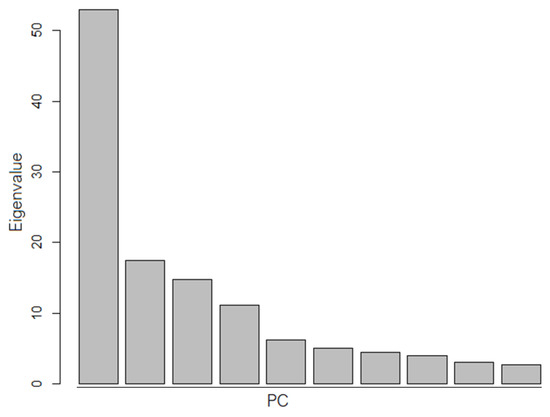 To determine the number of principal components, the scree plot, the Kaiser criterion, and the proportion of the variance explained by each component may be utilized [50,51,52]. Here we employed the combined scree plot and variance explained by each component.