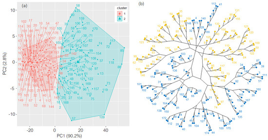 (a) Clusters (the values on the axes represent the scores on PC2 and PC1) and (b) the dendrogram from the hierarchical clustering of TITS. The elements in different clusters are in different colors.