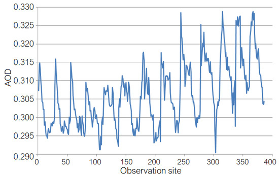 The sites are ordered in increasing order in latitude, and subsequently, by decrease latitude, from the left corner on the map of the studied region to the lower right corner. Details on the study area may be found in [4,40,41]. The coordinates of the sampling points are given in Table S1 in the Supplementary Materials. Data have been organized in a matrix, X, whose columns contain the AOD at each point, and the lines contain the monthly values at the observation points.
