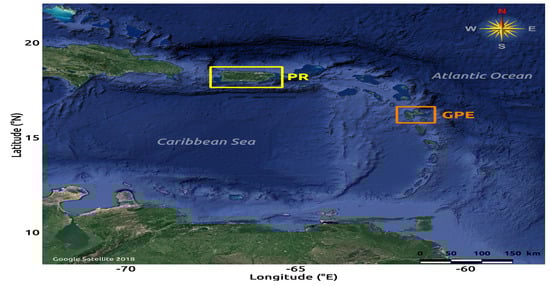 Overview of the Caribbean area with the location of Guadeloupe archipelago (16.25° N, −61.58° E; GPE in orange) and Puerto-Rico (18.23° N, −66.50° E; PR in yellow).