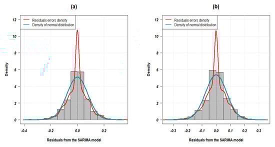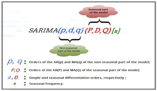 where B is the backward operator; and denote the polynomial functions of the autoregressive model of the non-seasonal and seasonal parts, respectively; and denote the polynomial functions of and of the non-seasonal and seasonal parts, respectively; is the residuals of the SARIMA model [51,52].