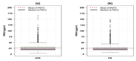The skewness coefficients in GPE and PR were different from 0, which is the reference value for the normality of a process [62,63]. Thus, the PM10 distribution for each area is not symmetric. Estimated kurtosis coefficients of 10.97 and 19.67 in GPE and PR exhibited a leptokurtic distribution.