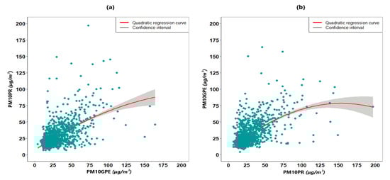 The red curve in the scatterplot in Figure 4 represents the second-order polynomial regression. For g/m, there is a homogeneity in the points distribution. For the other points, i.e., g/m, the distribution is heterogeneous. Thus, most of the data were below the g/m threshold recommended by the World Health Organization (WHO) [66]. These results are in agreement with the relationship stated in Section 2.2. The quadratic regression model equation where PM10PR (PM10GPE) is the response variable, and the explicative variable, is given by Equations (15) and (16), respectively: