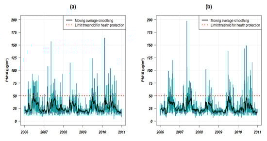Daily evolution of PM10 concentrations at (a) GPE and (b) PR from 2006 to 2010. The red horizontal dashed line shows the Air Quality Guideline for 24 h mean PM10 concentrations at 50 g/m [66]. The black curve represents the smoothed moving average series calculated by taking .
