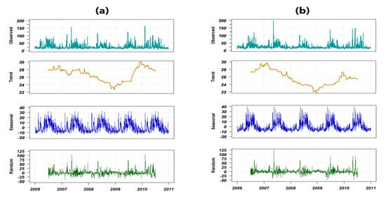 Figure 6 presents the decomposition of the two PM10 data series in GPE and PR according to an additive scheme. The top graph in (a) and (b) of it can be seen as a sum of: