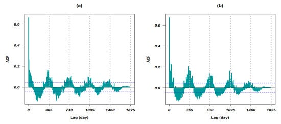 Autocorrelation function (ACF) of PM10 data at (a) GPE and (b) PR from 2006 to 2010 before the Box–Cox transformation and the seasonal differentiation. The gray vertical lines of equation denote the offsets that are multiples of 365.