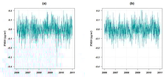 Chronogram of PM10 data at (a) GPE and (b) PR from 2006 to 2010 after the Box–Cox transformation and the seasonal differentiation.