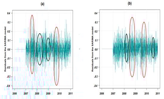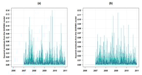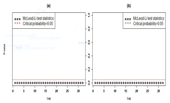 Concerning the residuals of the SARIMA model, we investigated their autocorrelations using the McLeod–Li test. Engle’s test allows us to evaluate their GARCH character, i.e., their conditional heteroskedasticity.