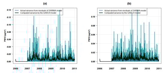 The SARIMA and GARCH processes have been applied in various fields such as mobile communication networks [39], climatology [40], tourism [41], and economics [42], to mention a few. No study has yet investigated the behavior of PM10 concentration using this framework.